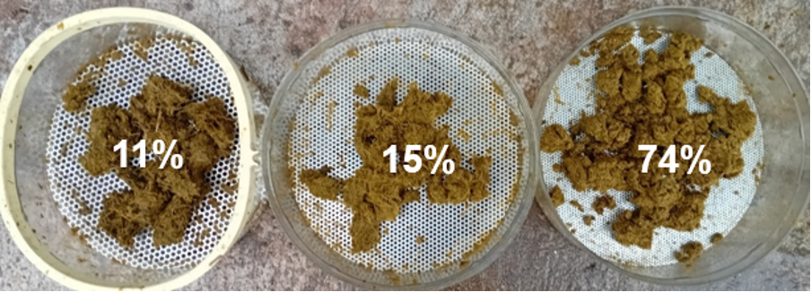 Efficiency tracking: Comparing dung before and after feed changes helps gauge the impact on digestion. Below is an example where the overall crude protein of a diet was increased and rumen efficiency increased, shown by the lower percentage of larger sized material retained in the top sieve on the left, demonstrating better feed efficiently. In this case an increase milk production was the outcome witnessed, and more feed was utilised in the rumen, hence the increase of material found in the bottom sieve (seen on the right hand side sieve).
